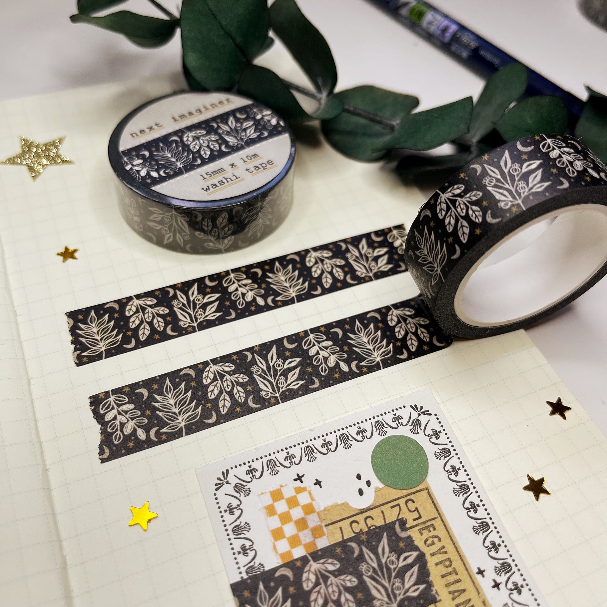 This listing is for 15mmx10m washi tape featuring my original art. The washi tape features leafy branches on a black background surrounded by crescent moons and stars.