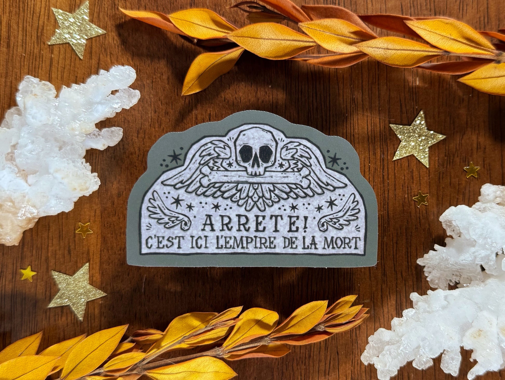 This die cut sticker is based on my trip to the catacombs in Paris. When you first enter the catacombs there is a sign overhead that reads, “Arrete! C’est ici l’empire de la mort.” Which means, “Stop! This is the empire of the dead.” The sticker features that quote on a tombstone with a skull and wings.