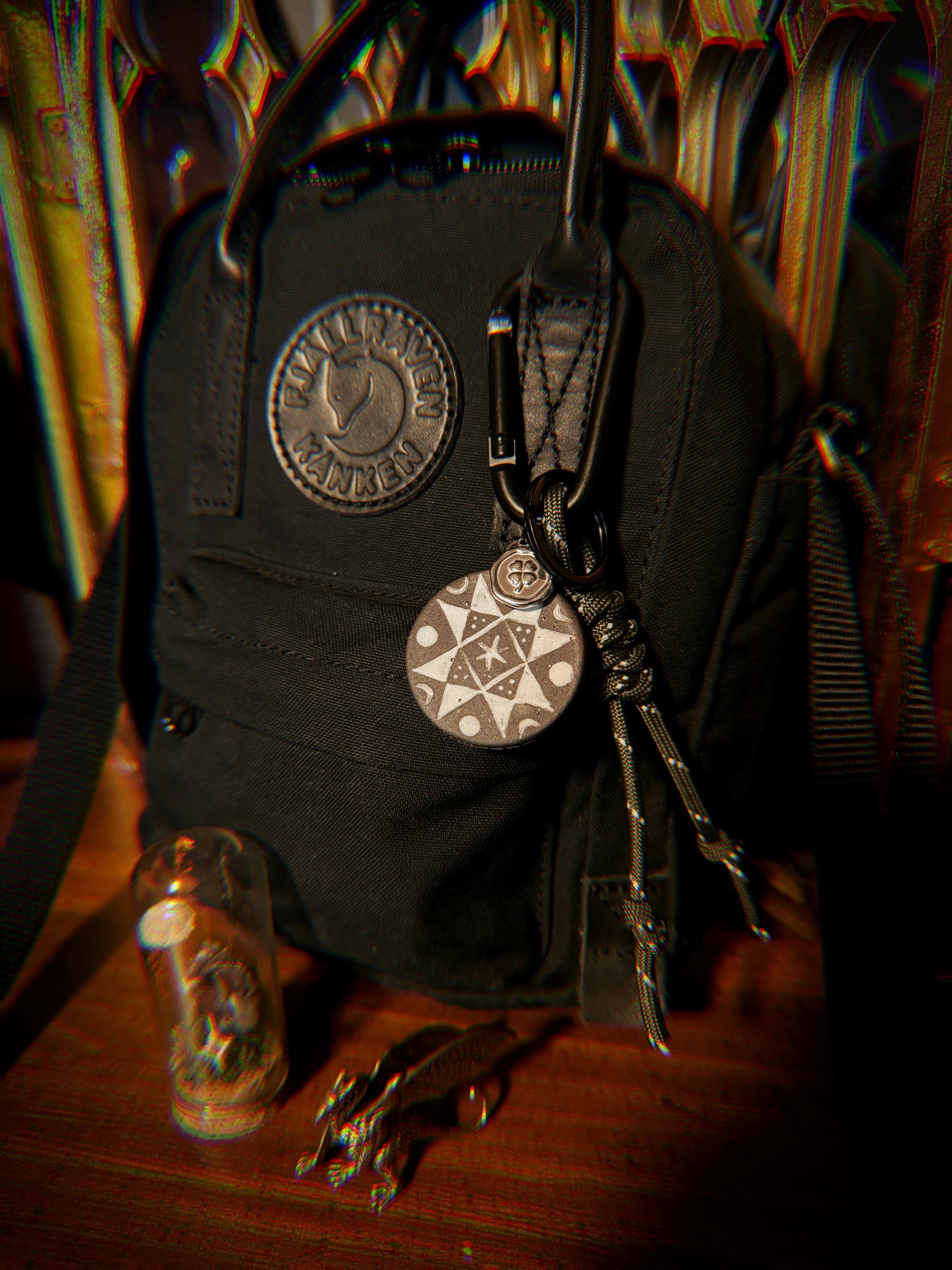 This ceramic bag charm/keychain features a white lone star quilt block on black clay with a little silver 4-leaf clover charm, an olive paracord braid and black keyring on a black carabiner. The ceramic charm and clover charm is reinforced with a mini keyring so it doesn’t snag and break off. I’ve tested mine on my every day bag for over 3 months (at the time of writing this) and it’s still holding strong!