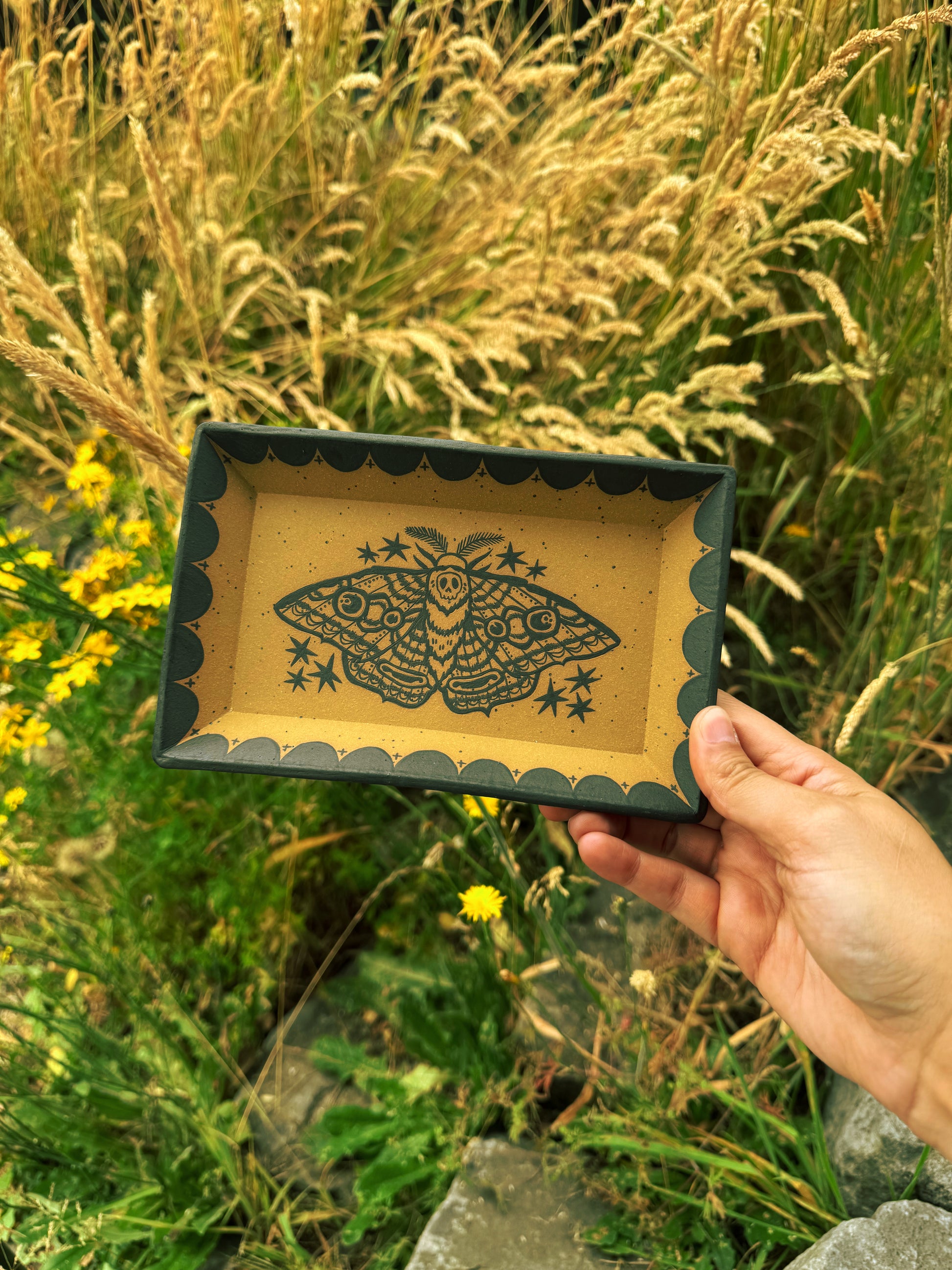 This ceramic tray features an original moth with stars around on a speckled gold clay and a black scalloped border.