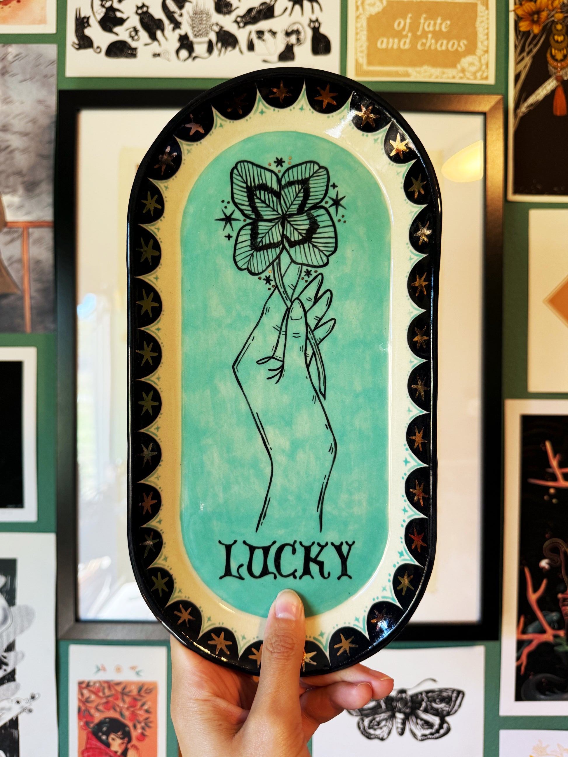 This ceramic tray features a 4-leaf clover on a turquoise background and a black scallop border. Each scallop also has gold lustered stars and little gold luster detailing around the clover. This was slab rollled and hand painted by yours truly.