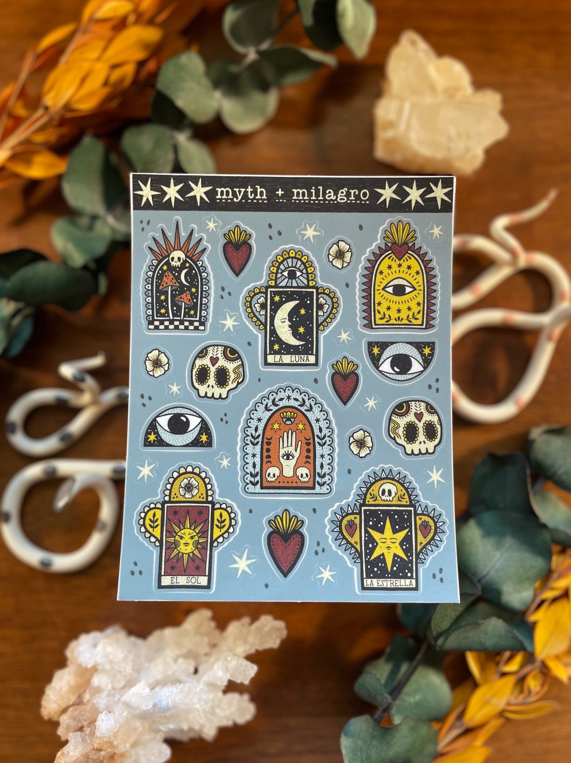 "Mystical Mexican Shrine" sticker sheets showcases Mexican shrines - or nichos - with celestial or witchy themes.