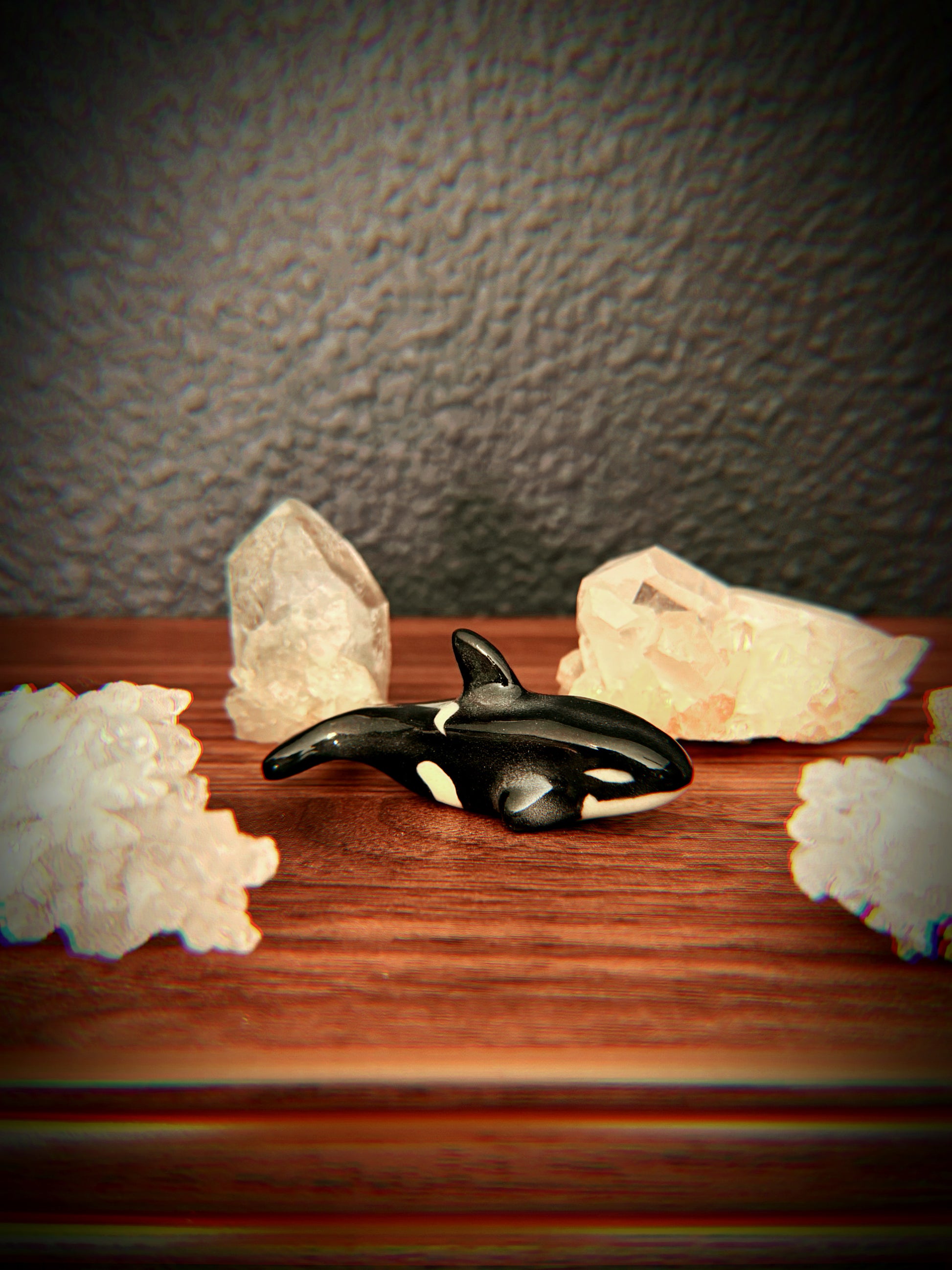 This ceramic orca figurine was sculpted, hand painted and glazed entirely by me! It measures 1” tall, 2.5” in length, and .875” wide