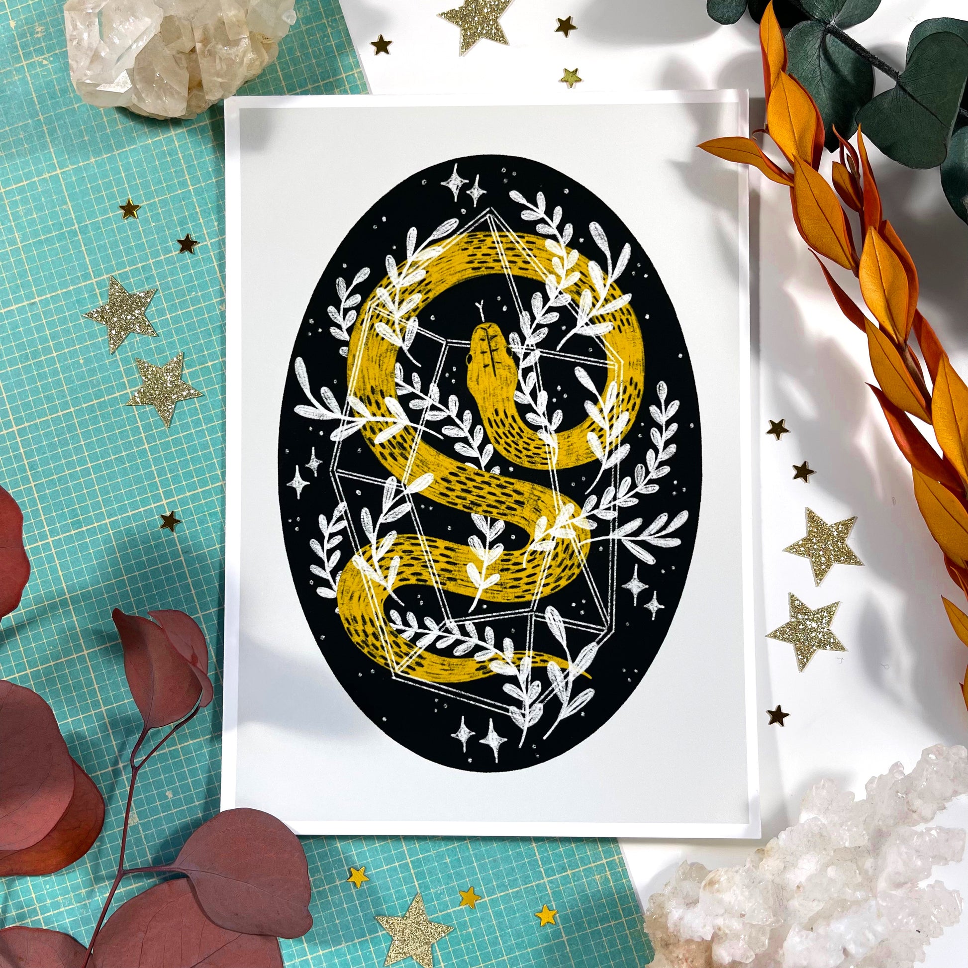 This listing is for a 5"x7" art print featuring my original art. The print is of a snake wrapped around a crystal and surrounded by leafy vines and stars.