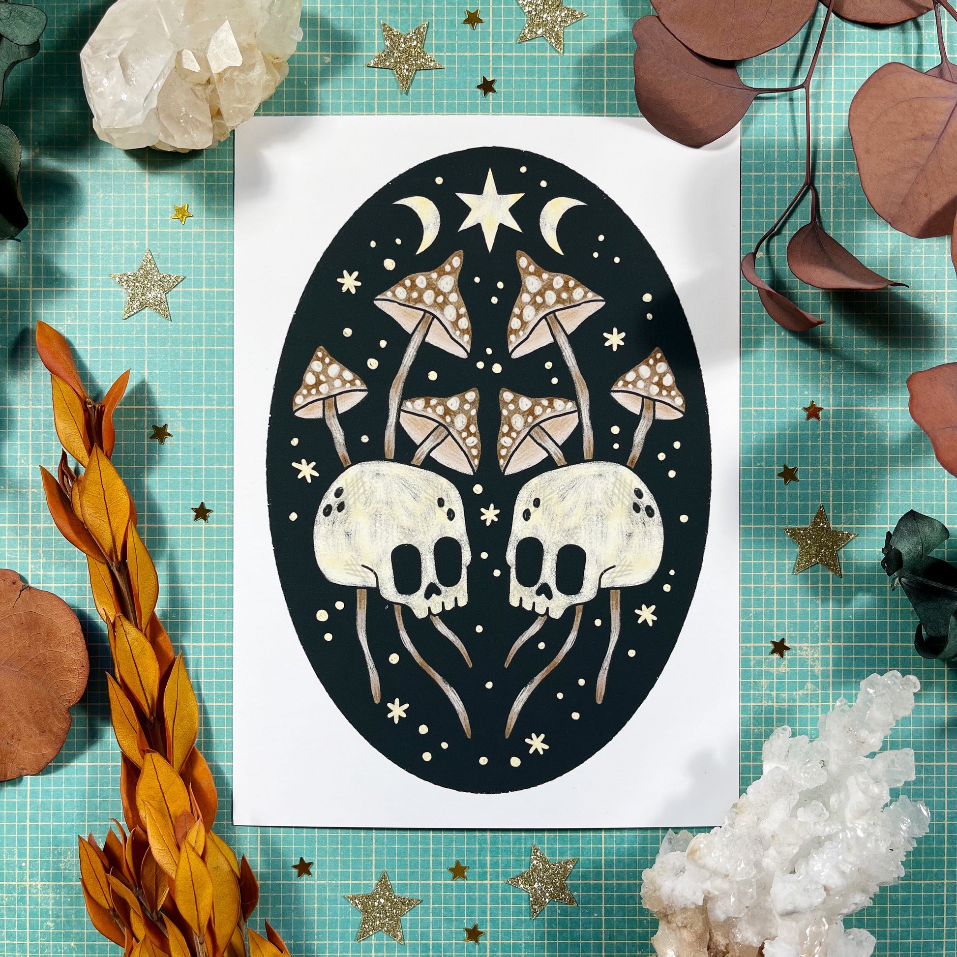 This listing is for a 5”x7” hand-signed print featuring my original artwork. The print features a mirror image of two skulls surrounded by mushrooms with stars around them.