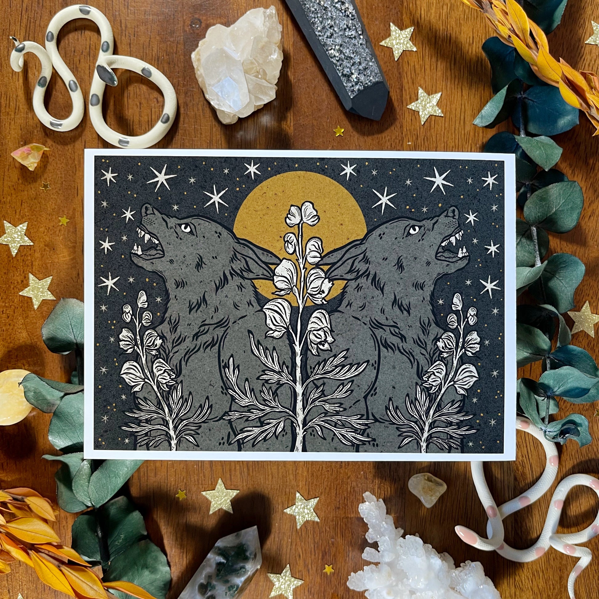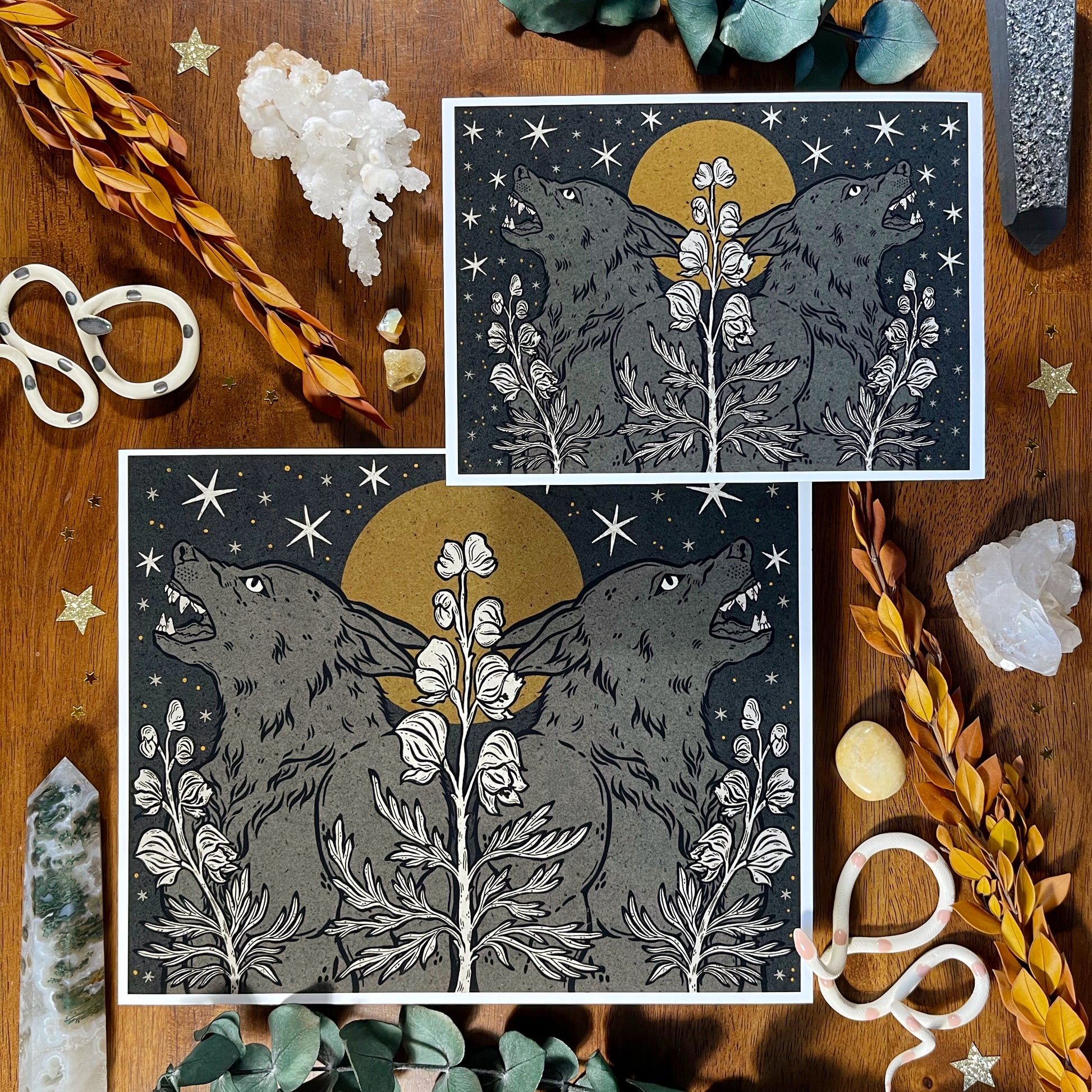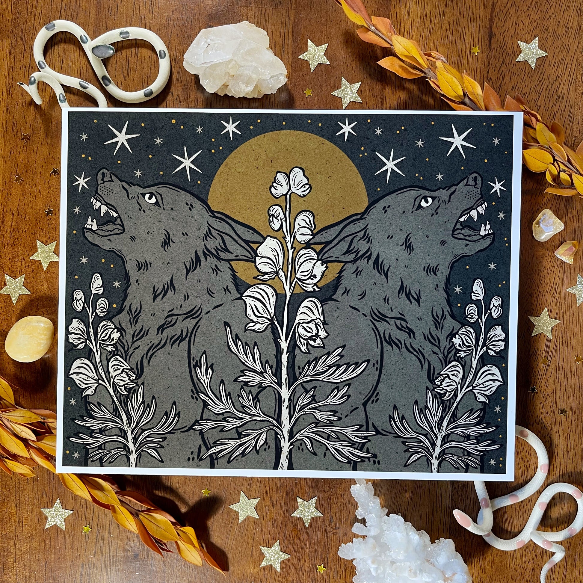 This listing is for either a 5”x7” OR 8"x10" hand-signed print featuring my original artwork. The print features a two back to back werewolves surrounded by wolfsbane sprigs, a golden full moon and stars.